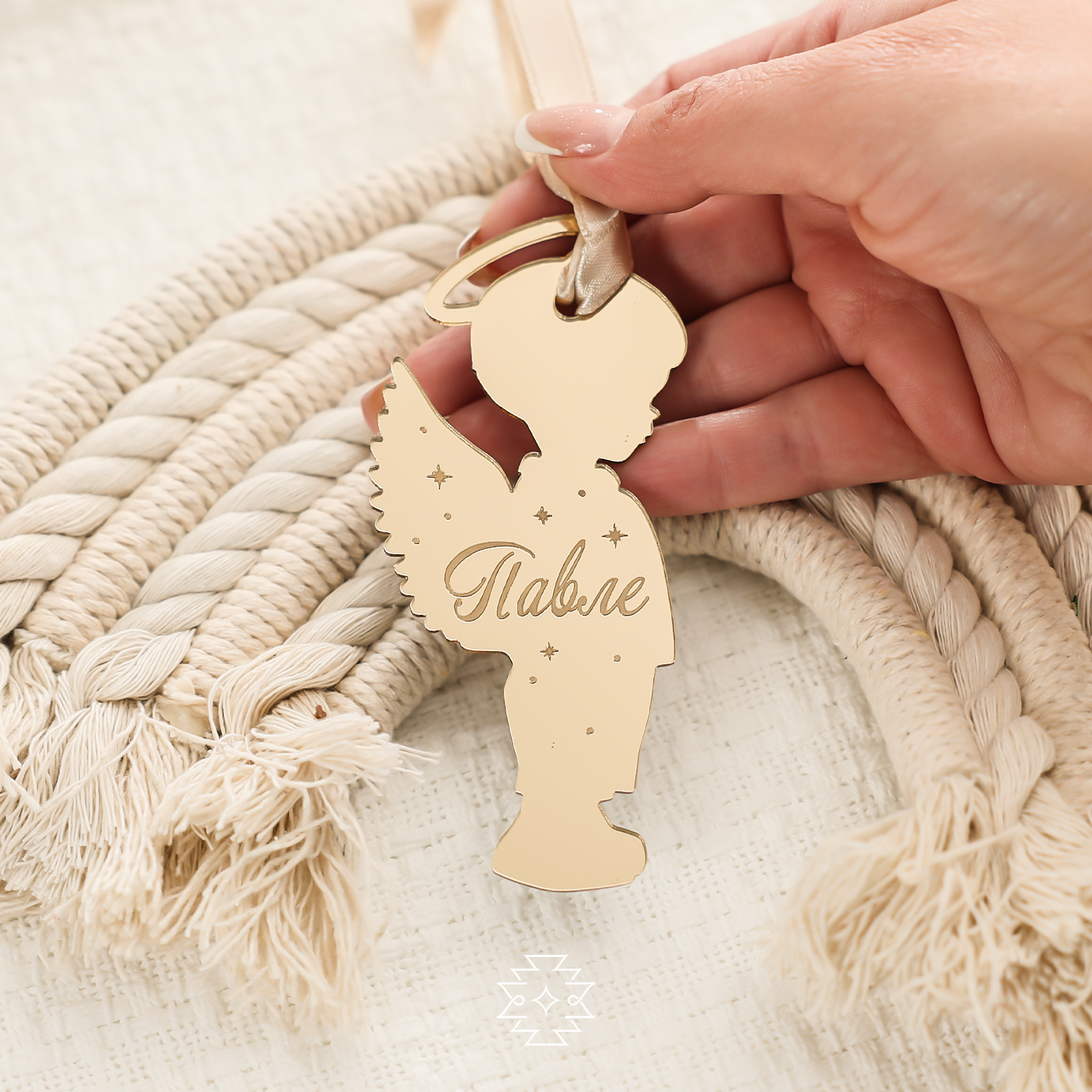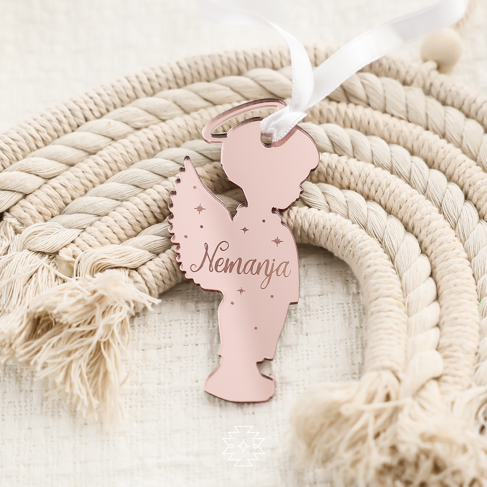 Personalizovani novogodišnji ukras u obliku anđela dečaka sa natpisom po želji.