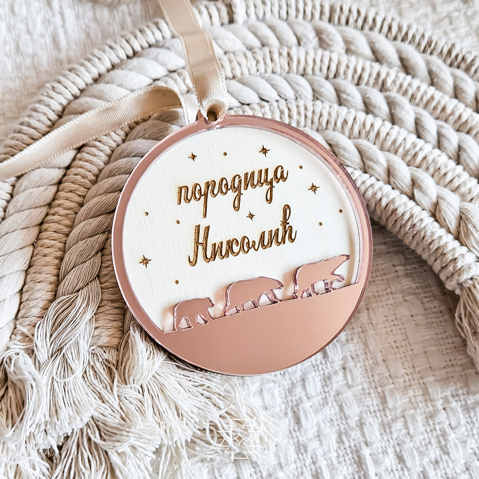 Personalizovani novogodišnji ukras sa drvenom osnovom i okvirom od zlatnog, srebrnog ili roze ogledalo pleksiglasa. Motiv porodica medveda.