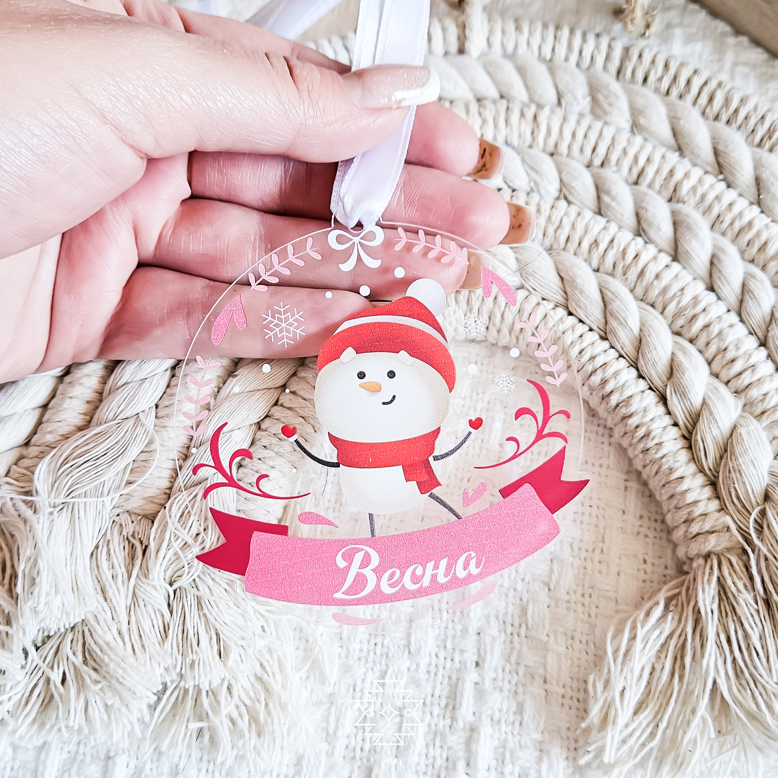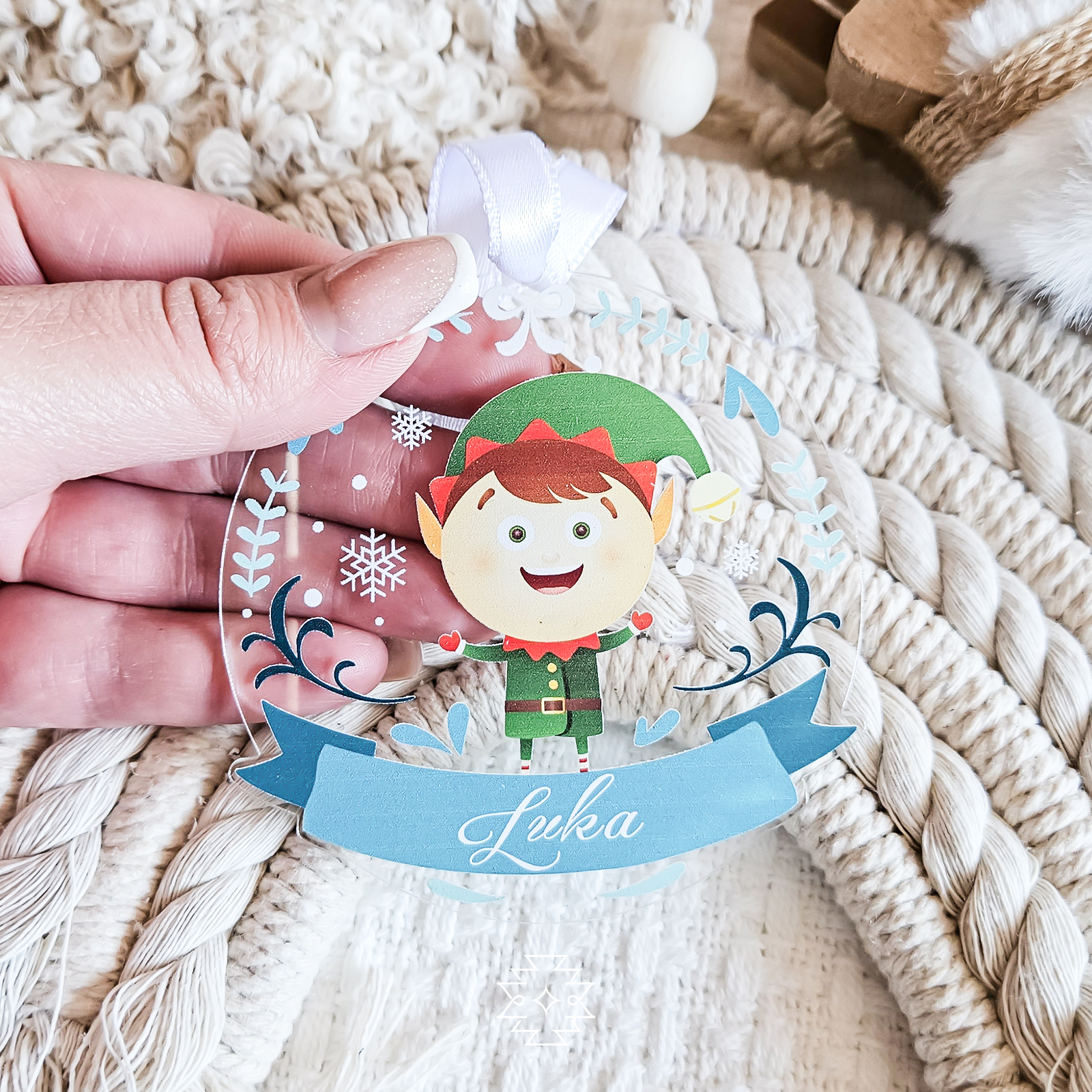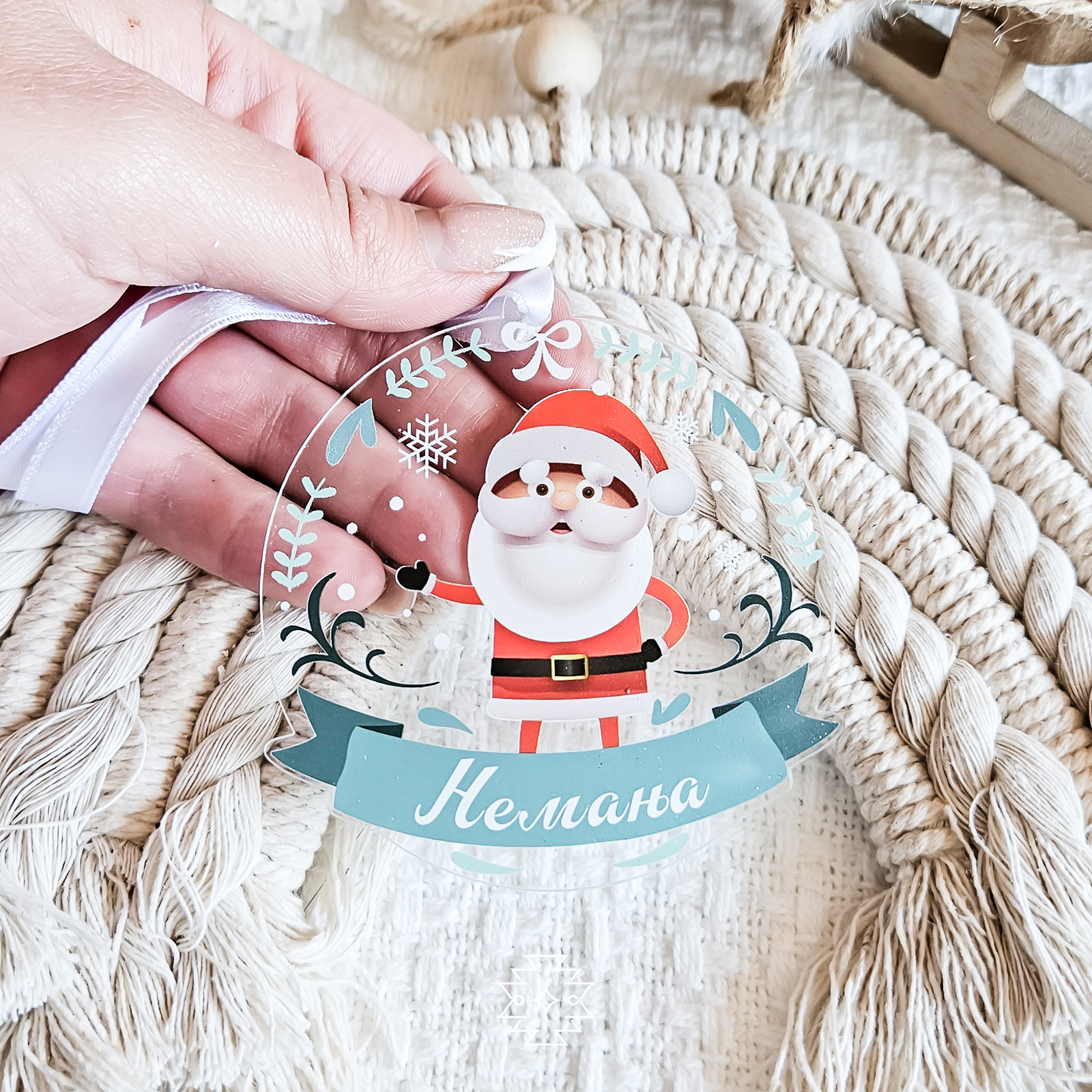 Štampani ukras sa motivima Deda Mraza, sneška, irvasa ili vilenjaka na providnom pleksiglasu. Možete personalizovati ukras natpisom po želji.