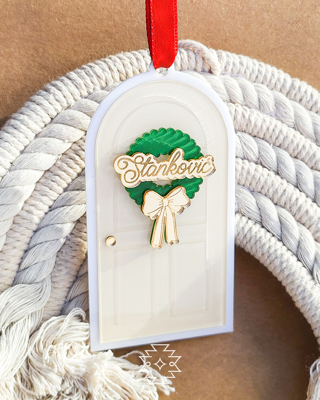Personalizovani ukras u obliku vrata sa vencem.